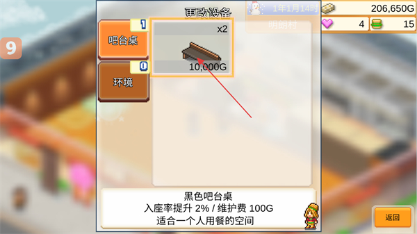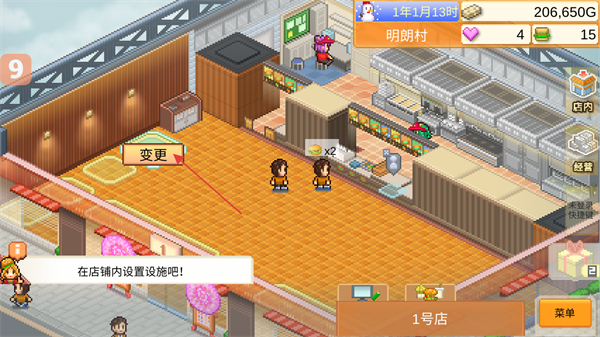 1、在餐廳內(nèi)點(diǎn)擊可建造物品的區(qū)域點(diǎn)擊變更,進(jìn)行店鋪內(nèi)設(shè)施建設(shè)。