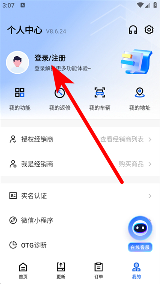 2、在個人中心頁面中,點擊登錄注冊,進入注冊頁面。