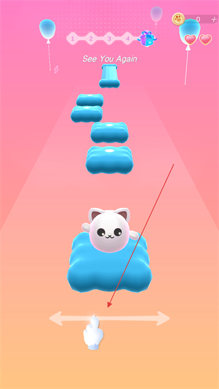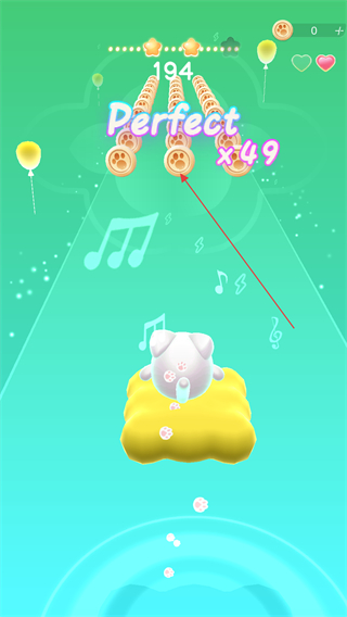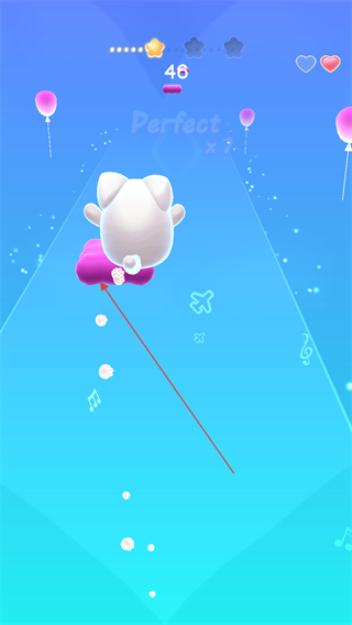 1、進(jìn)入游戲操控貓咪,左右滑動(dòng)屏幕控制移動(dòng)方向,準(zhǔn)確踩中音符云塊。