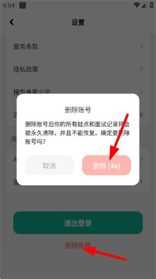 3、在設置頁面點擊刪除賬號,在彈出的確認框中點擊刪除,完成賬號注銷操作。
