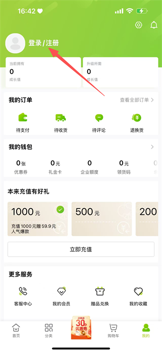 3、在我的頁面,點(diǎn)擊登錄/注冊,進(jìn)入登錄注冊頁面。