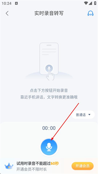 2、在實時錄音轉(zhuǎn)寫頁面點擊下方麥克風(fēng)按鈕,開始錄音。