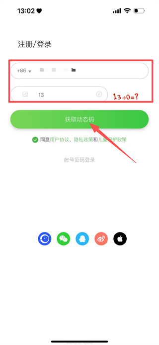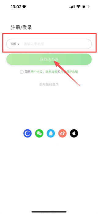 2、在注冊(cè)/登錄頁(yè)面,輸入手機(jī)號(hào),點(diǎn)擊獲取動(dòng)態(tài)碼。