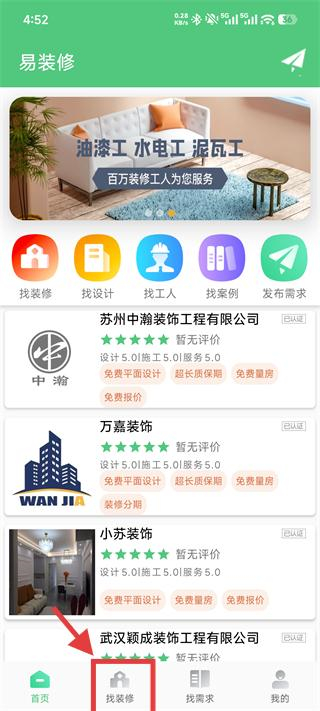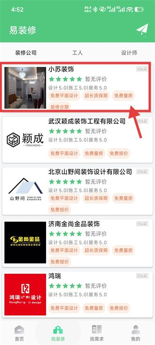 1、打開(kāi)裝修服務(wù)類APP,點(diǎn)擊底部找裝修選項(xiàng),進(jìn)入裝修公司列表頁(yè)面。