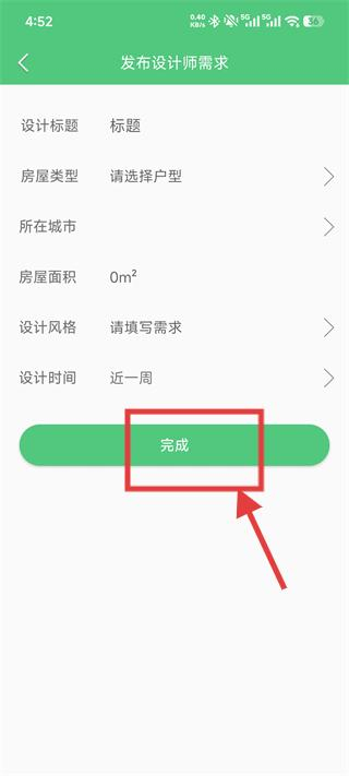 4、在發(fā)布設(shè)計(jì)師需求頁(yè)面,填寫(xiě)設(shè)計(jì)標(biāo)題、房屋類型、所在城市、房屋面積、設(shè)計(jì)風(fēng)格、設(shè)計(jì)時(shí)間等信息后,點(diǎn)擊完成按鈕,提交設(shè)計(jì)師需求。