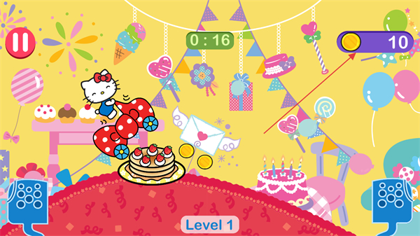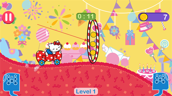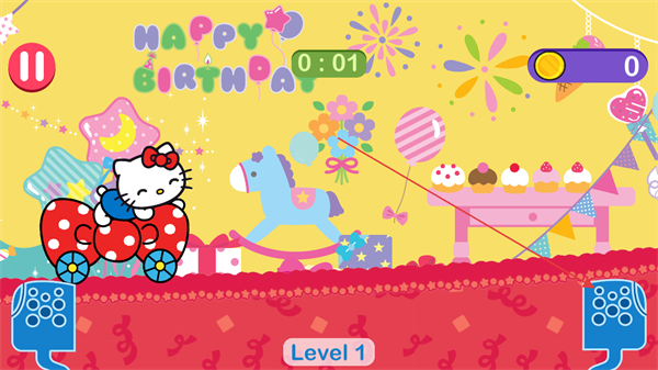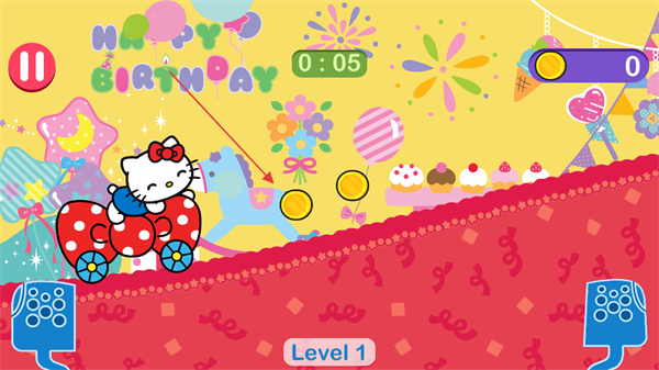 1、操控凱蒂貓駕駛小車在生日主題跑道上行駛,注意時(shí)間限制,收集金幣。