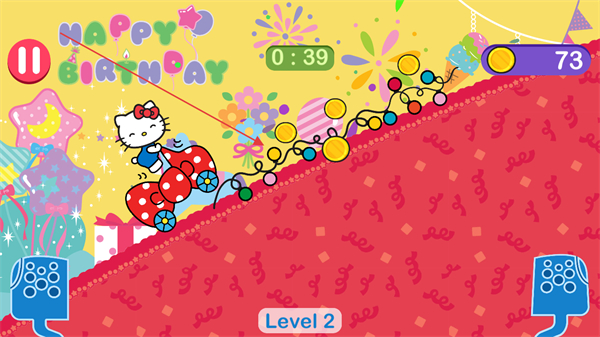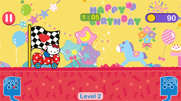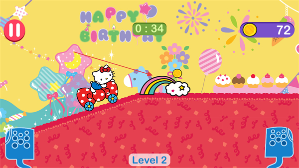 1、在Level2跑道上,駕駛凱蒂貓小車收集金幣,利用彩虹道具獲取額外金幣。