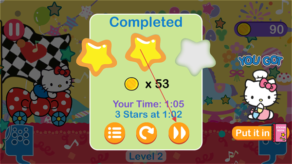 4、通關(guān)后領(lǐng)取金幣獎勵,可選擇繼續(xù)挑戰(zhàn)或進(jìn)入下一關(guān),爭取獲得三星評價。