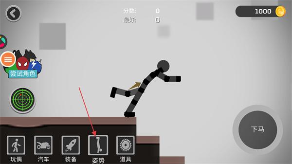 3、點(diǎn)擊下方的姿勢(shì)按鈕,調(diào)整火柴人下墜前的姿勢(shì)體態(tài)。