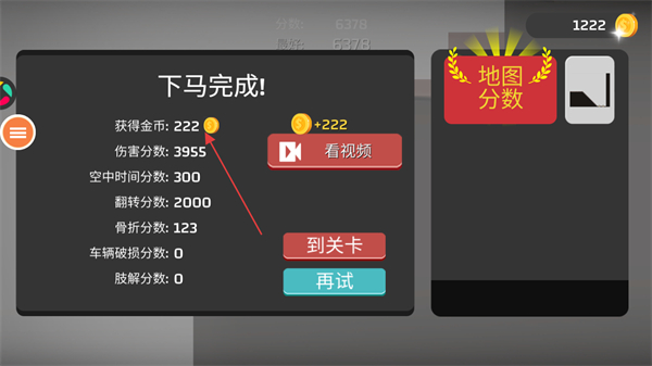 4、下馬完成后,會(huì)根據(jù)關(guān)卡內(nèi)對(duì)火柴人造成的傷害分?jǐn)?shù)進(jìn)行金幣的獲取。
