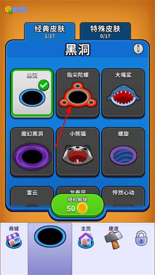 2、選擇黑洞皮膚,如指尖陀螺等,可更換黑洞外觀,豐富體驗(yàn)的核心操作,選擇時(shí)根據(jù)皮膚的風(fēng)格進(jìn)行挑選。