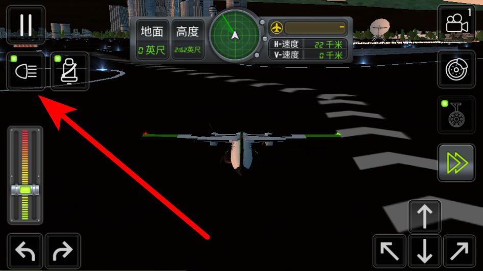 2、飛行過程中點擊左側燈光按鈕,開啟飛機燈光,這一操作不僅能提升夜間或復雜天氣下的飛行可見度,還能在救援場景中起到定位和警示作用,保障安全開展。