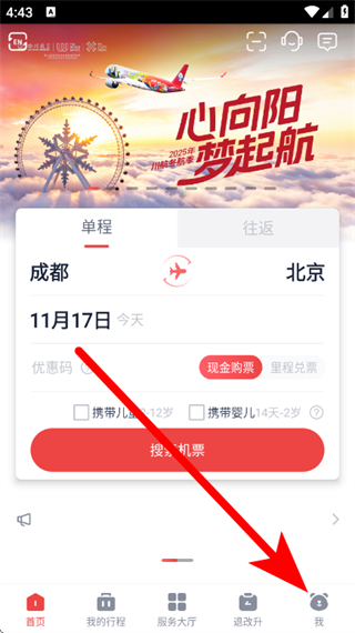 1、打開四川航空,在首頁點擊底部我,進入我的頁面。