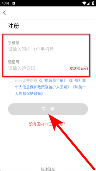4、輸入手機號,輸入驗證碼后,勾選已閱讀并同意相關(guān)協(xié)議,點擊下一步,完成注冊。