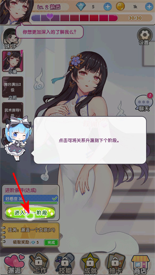 2、點擊進入下一階段按鈕,可提升與角色的關系等級,這是深化角色羈絆的核心操作,提升時需滿足關系進度要求。
