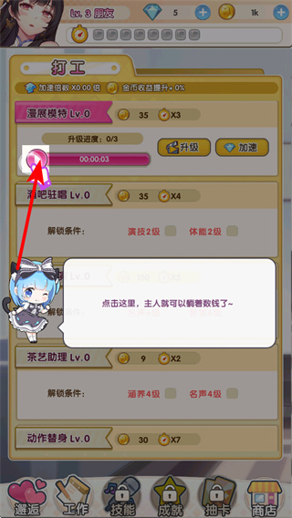 4、點擊提升1倍速按鈕,可加速打工項目的升級進程,這是優(yōu)化資源獲取的關鍵策略,根據(jù)鉆石數(shù)量合理使用該功能。