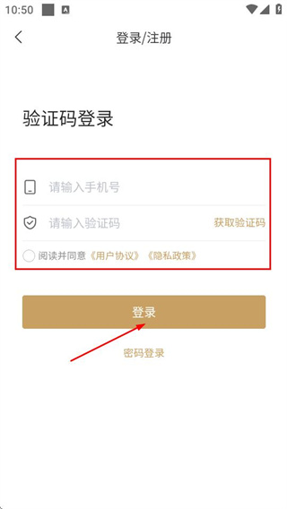 3、在驗證碼登錄區(qū)域輸入手機號、獲取并填寫驗證碼,勾選協(xié)議后點擊登錄,完成登錄操作。