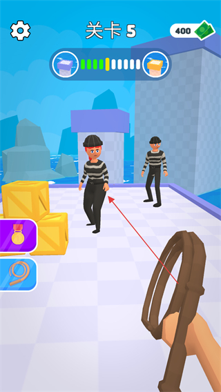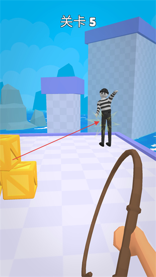 1、在關卡5中,瞄準條紋服裝的目標人物,發(fā)射皮鞭纏住他們。