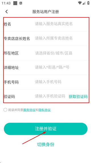 3、填寫表單中的姓名、專賣店店長姓名等信息,勾選協(xié)議后點擊注冊并驗證,完成服務站用戶注冊操作。