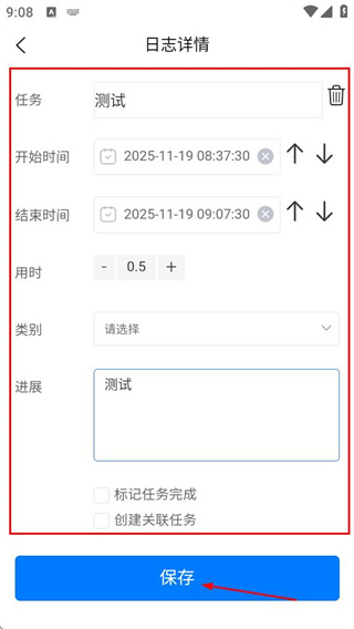 3、在日志詳情頁面填寫任務(wù)、時(shí)間等信息后,點(diǎn)擊【保存】按鈕,完成日志的創(chuàng)建操作。