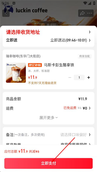 5、在訂單確認(rèn)頁(yè),選擇收貨地址后點(diǎn)擊立即支付,完成外賣(mài)下單操作。