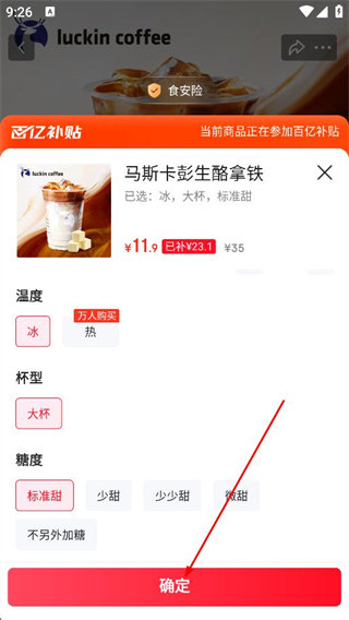 4、在商品規(guī)格選擇頁(yè),選擇溫度、杯型、糖度等規(guī)格后,點(diǎn)擊確定。