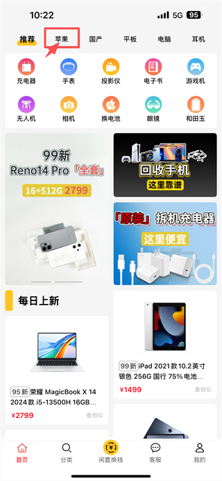 1、打開數(shù)碼交易類APP,點擊頂部蘋果分類選項,進入蘋果產(chǎn)品頁面。