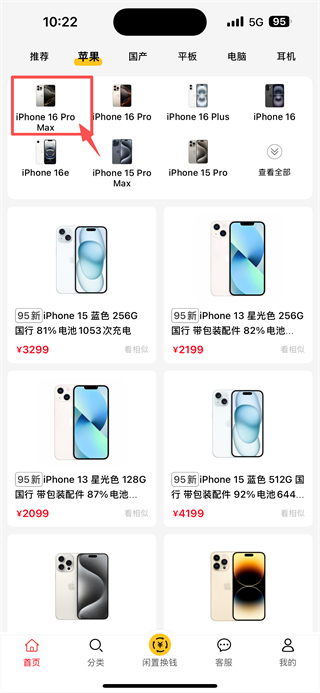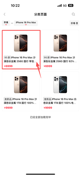 3、在分類頁面里,選擇95新iPhone16ProMax沙漠色鈦金屬256G國行的商品條目,進入商品詳情頁。