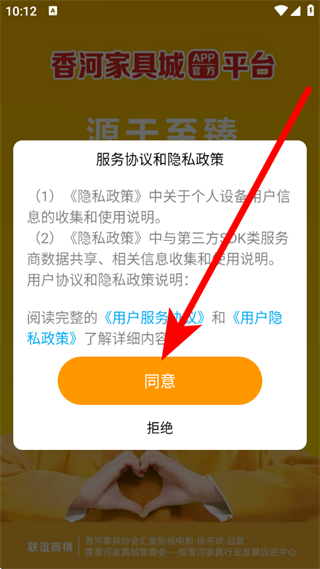 1、打開香河家具城,在服務(wù)協(xié)議彈窗中,點(diǎn)擊同意。