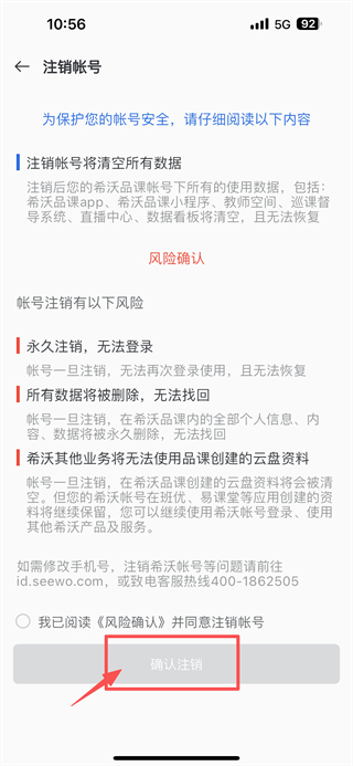 4、在注銷帳號(hào)頁(yè)面,閱讀風(fēng)險(xiǎn)確認(rèn)內(nèi)容后,勾選同意協(xié)議并點(diǎn)擊確認(rèn)注銷按鈕,完成帳號(hào)注銷操作。
