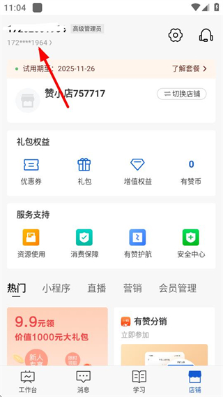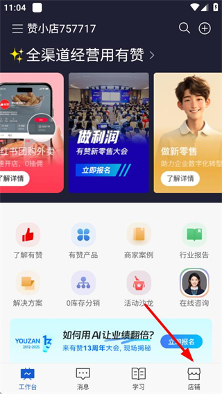 1、在有贊微商城首頁(yè),點(diǎn)擊右下角店鋪選項(xiàng),進(jìn)入店鋪?lái)?yè)面。