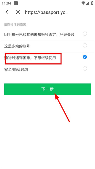 5、在注銷原因選擇頁(yè)面,選擇注銷原因后點(diǎn)擊下一步,進(jìn)入注銷確認(rèn)頁(yè)面。