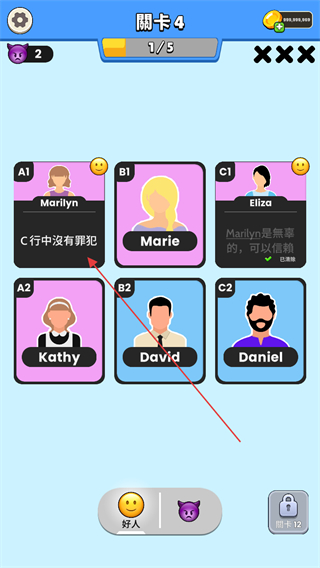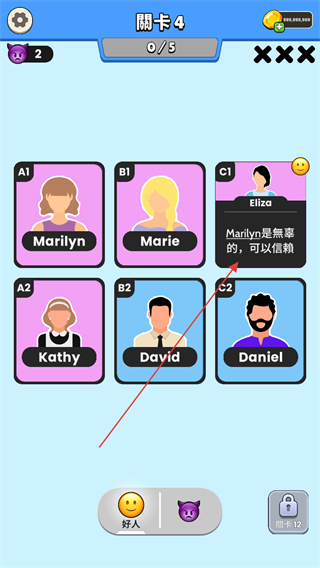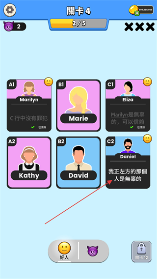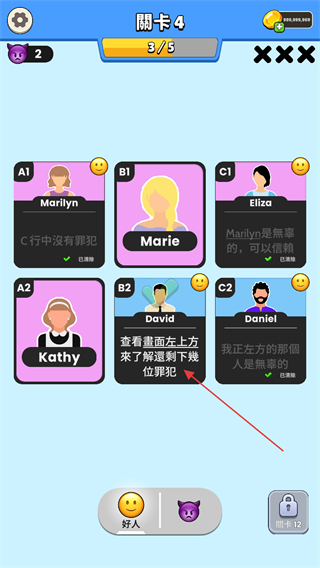 4、點(diǎn)擊David卡片,根據(jù)其線索,標(biāo)記為好人,逐步找出所有好人,完成關(guān)卡。