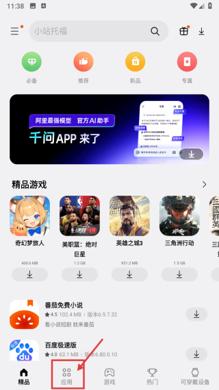 1、打開應用商店類APP,點擊底部應用選項,進入應用頁面。
