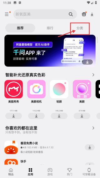 2、在應用頁面,點擊分類選項,進入應用分類頁面。