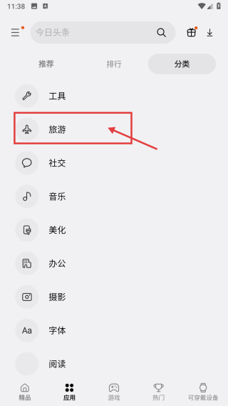 3、在應用分類頁面,點擊旅游分類選項,進入旅游應用列表頁。