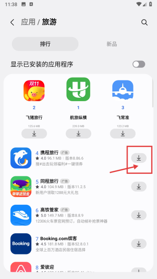 4、在旅游應用列表里,選擇攜程旅行應用條目,點擊下載按鈕,進行該應用的下載操作。