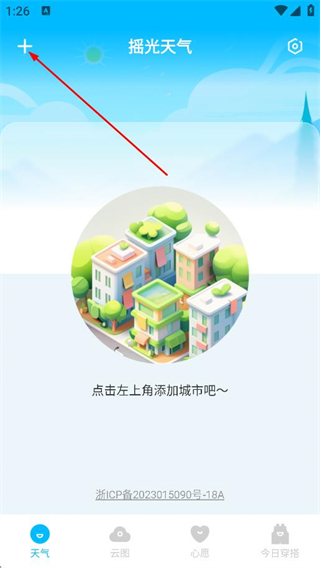 1、在搖光天氣首頁,點(diǎn)擊左上角+,進(jìn)入城市列表頁面。
