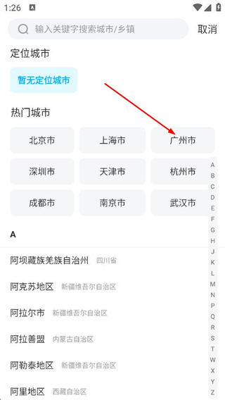 3、在城市選擇頁面,可搜索或直接點(diǎn)擊熱門城市,選擇目標(biāo)城市。