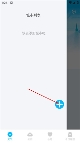 2、在城市列表頁面,點(diǎn)擊右下角+,進(jìn)入城市選擇頁面。