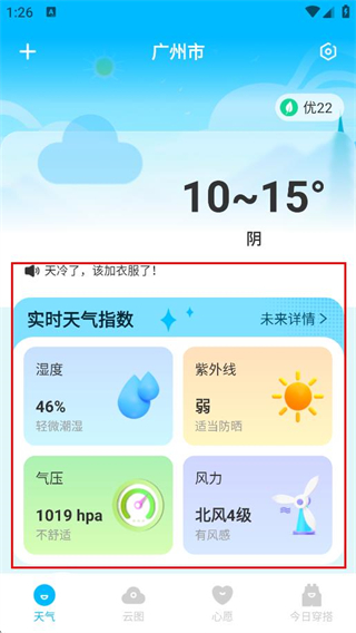 4、選擇城市后,即可查看該城市的天氣信息,包括實(shí)時(shí)天氣指數(shù)。
