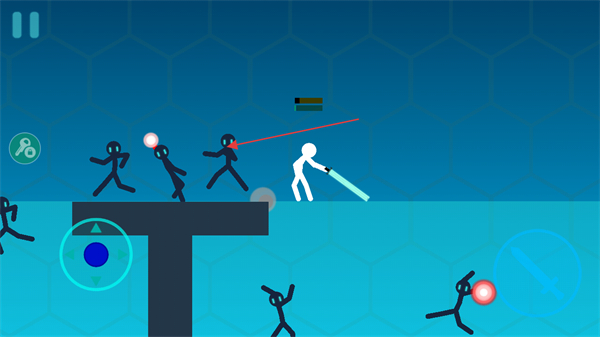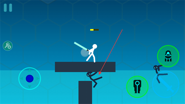 3、在平臺上與敵方火柴人戰(zhàn)斗,通過揮劍和走位,將敵人擊落下平臺。