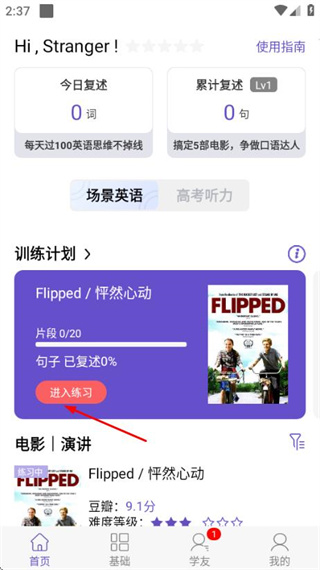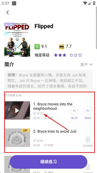 2、在練習(xí)頁面中,點(diǎn)擊句子條目,進(jìn)入該片段的朗讀練習(xí)界面。