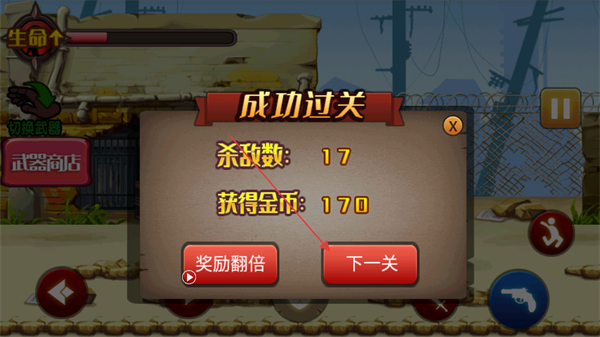 4、擊敗所有敵人后顯示成功過(guò)關(guān),可查看殺敵數(shù)和金幣,點(diǎn)擊下一關(guān)進(jìn)入新挑戰(zhàn)。