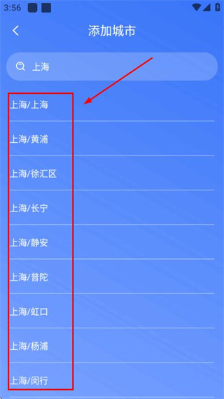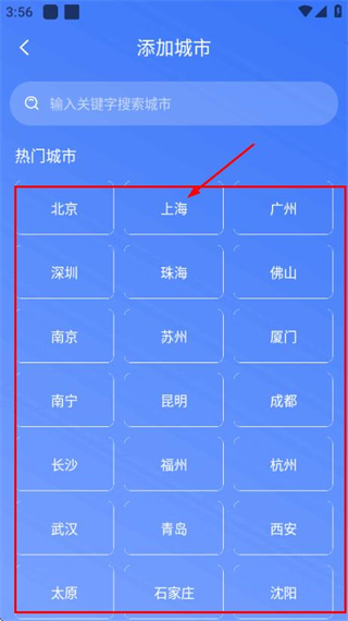 3、在添加城市頁面的熱門城市區(qū)域點(diǎn)擊目標(biāo)城市,顯示對應(yīng)的區(qū)域選項(xiàng)列表。