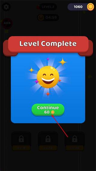 3、點擊顯示“Continue60”的綠色按鈕,領(lǐng)取獎勵并進入下一關(guān)。
