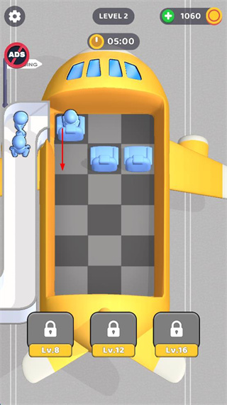 4、在后續(xù)的游戲界面中,繼續(xù)引導(dǎo)乘客進入飛機內(nèi)的藍色座位,完成新的乘客安置任務(wù)。