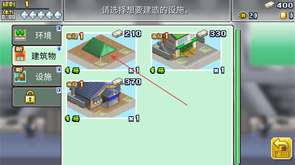 4、建造頁面中可以選擇環(huán)境、建筑物和設(shè)施幾種不同的選項,搭建的每個建筑都要消耗金錢。