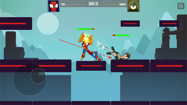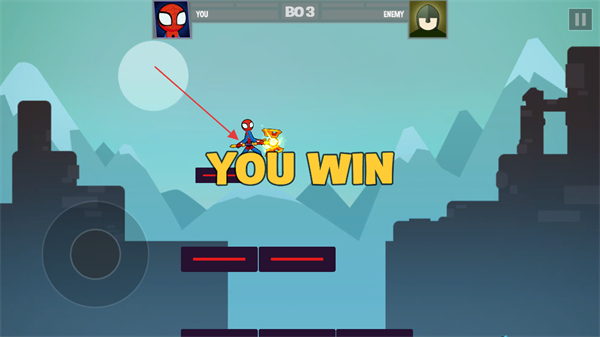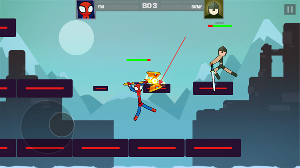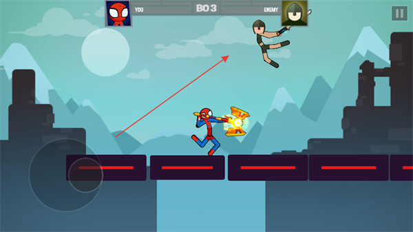1、操控蜘蛛火柴人移動,利用武器攻擊敵方火柴人,注意躲避其攻擊。