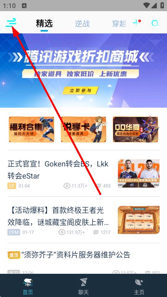 1、打開騰訊游戲助手app,點擊首頁左上角三條橫線圖標。